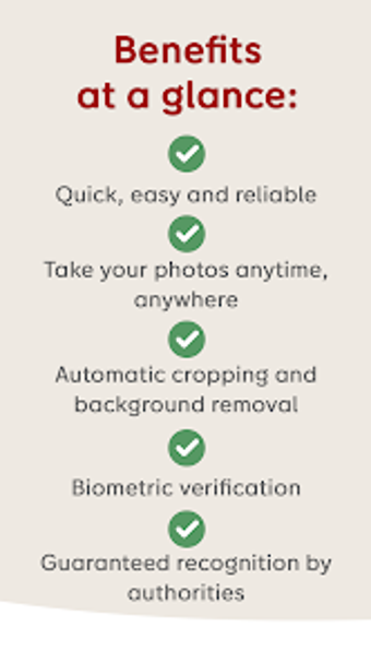 باختصار، يتيح لك تطبيق CEWE Passport Photo التقاط صور مناسبة ومتوافقة كإمضاء بيومتري شخصي فريد لـ الهويات الحكومية والمستندات. بمجرد التأكيد، يمكنك البدء في التقاط صورة باستخدام كاميرا هاتفك الذكي، واختيار الصورة التي تعجبك أكثر، وسيتم قصها تلقائيًا وإزالة خلفيتها لتناسب القالب الذي اخترته.
